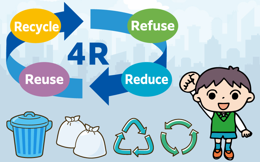 みんなが暮らす相模原市では、一般ごみの減量化・資源化のために、 “Reduce”=ごみになる物を減らす “Reuse”=物をくり返し使う“Recycle”=再び資源として使う、の3Rに“Refuse”=不必要な物は買わない、使わない、の1Rを加えた4Rを進めているよ。