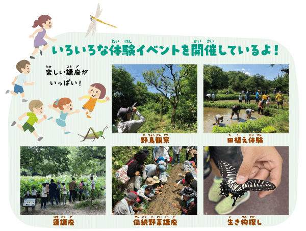 隣にある「自然体験観察園」では、動物や植物を観察したり、お米作りなどのイベントに参加したりできるよ。お友達やおうちの人といっしょに行ってみよう!