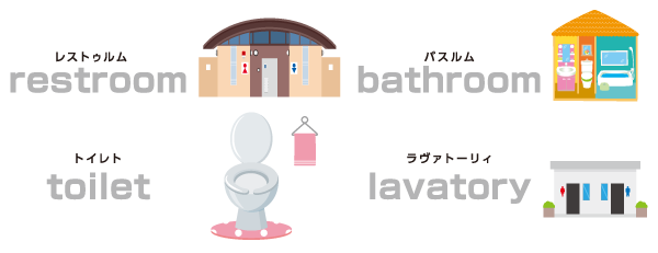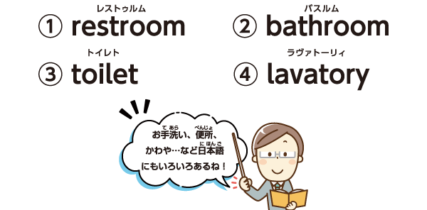 答えは①~④のすべてがトイレを意味する英単語だよ。①restroomは、アメリカ英語で公共の場所や商業施設のトイレを指すときに使われることが多いよ。②bathroomは、自宅のトイレを指すことが多く、お風呂やシャワーをふくむこともあるよ。③toiletは、主にイギリスで使われる英語。④lavatoryは、公衆施設のトイレによく使われる表現だよ。