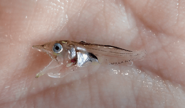 大きな口で魚を丸のみするサワラの稚魚