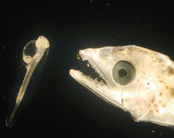 卵から産まれたサワラの赤ちゃんは、カタクチイワシやクロダイなどの魚の赤ちゃんを食べてぐんぐん成長し、ふ化して10日後には体長1㎝に成長します。このころにはすでに、するどい歯が生えてきて、えさになる魚をしっかりとらえ、大きな口で魚を丸のみにし、自分と同じぐらいの大きさのサワラまで食べようとします。