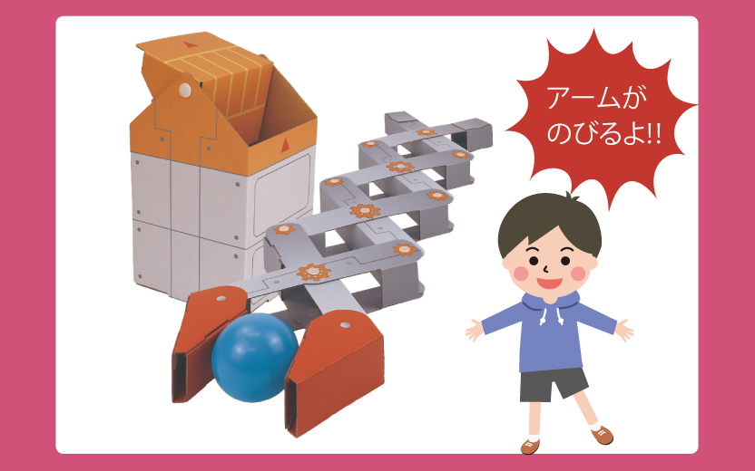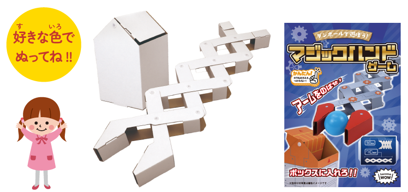 そして、今月紹介するのは「マジックハンドゲーム」だよ。この「マジックハンドゲーム」は、部品を台紙から抜き、組み立てていくだけでマジックハンドが完成! 基本的に、はさみとのりは不要だから、とてもかんたんに作ることができるよ。