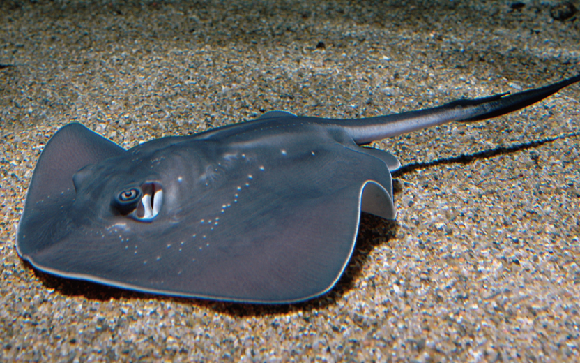 日本海ゾーンの大水槽を優雅に泳ぐ姿が人気のホシエイは、エイの中では大きい方です。体盤幅が180㎝にもなり、同じ水槽で展示中の125㎝ほどのホシザメを上回る大きさです。ホシザメもホシエイも、海底近くを泳ぐのを好む軟骨魚で、どちらも名前の由来は星に見える背中の白い斑点にあります。 ところが、ホシエイの場合、その「星」は模様ではなく、白いふちが付いている穴なのです。ホシエイの「星」は実はロレンチーニびんと呼ばれる感覚器官の開口部です。神経でつながっているこの器官には、生物が発する微弱な電気を察知する役割があります。