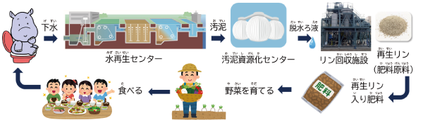 下水にふくまれるリンは、肥料として、そして農産物となって私たちの所へもどり、下水へと帰っていくよ。再生リンを使って育てた農産物を食べることは、リン資源の循環につながるんだ!