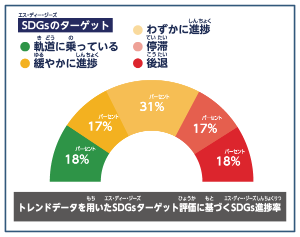 国連の2025年のレポートによると、軌道にのっているか、ゆるやかに進捗しているターゲットは35%に留まっているんだ。特に、気候変動や貧困、飢餓などが大きな問題になっているんだって。2030年までの最後の5年間を最大限活用することがとても重要で、そのためには、みんなが力を合わせることが大切なんだ。