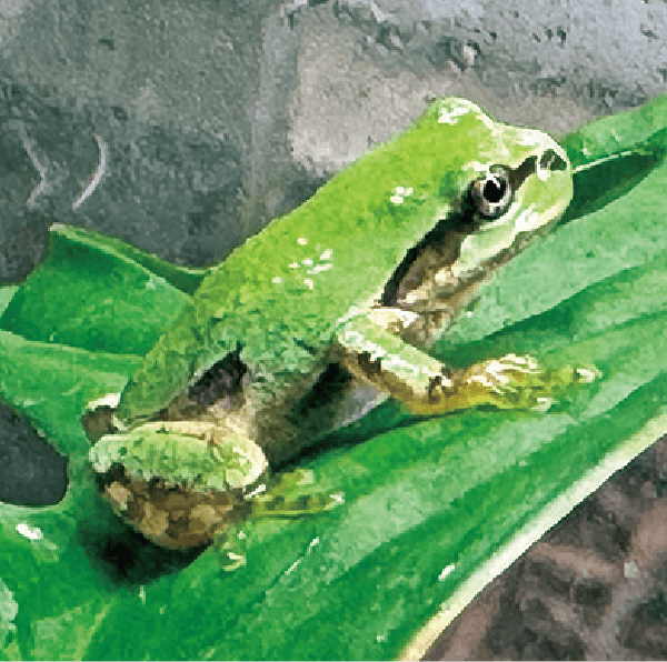みなさんはカエルの鳴き声を聞いたことはありますか。それは私たちの身近な所にすんでいるヒガシ二ホンアマガエルの声かもしれません。ヒガシ二ホンアマガエルは、森の中の水辺や田んぼなどに生息しています。実は鳴くのは繁殖期のオスだけ。メスに自分の居場所を伝えるために鳴くのです。また繁殖期のオスには、メスにだき付きやすいように親指がぽっこりとふくらむ「だきだこ」ができます。