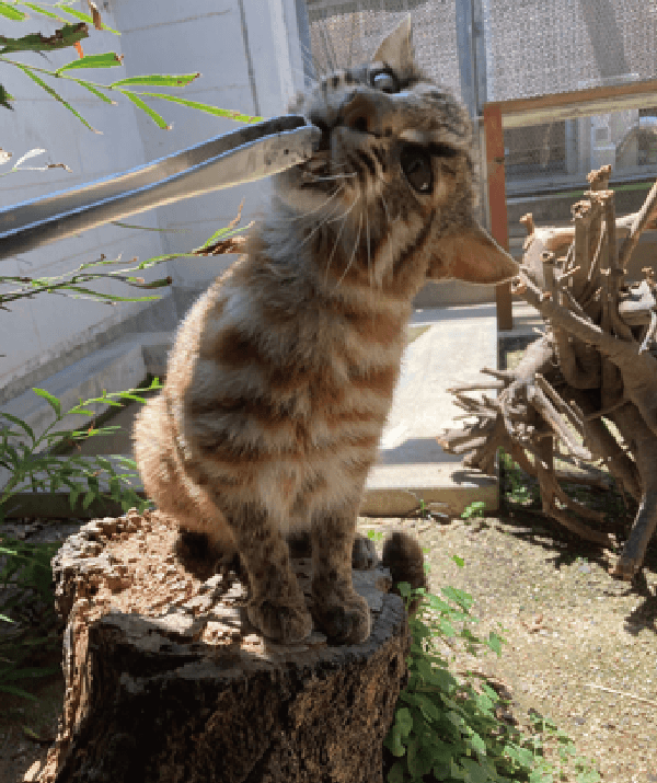 来園者のみなさんに見ていただける展示場には、18才のご長寿「キイチ」がいます(野生のツシマヤマネコの寿命は6~9才)。2017年には2頭の子どもをもうけ、昨年来園したシュウシのおじいちゃんにあたります。