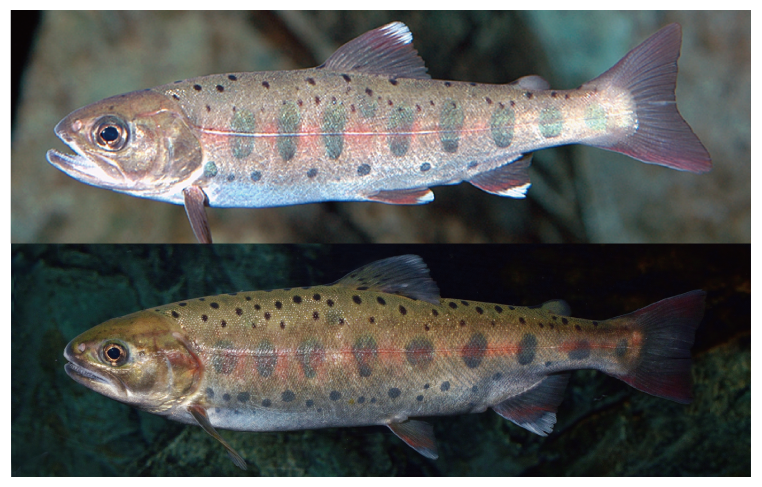 ヤマメと呼ばれるサクラマスの「河川残留型」。下は成魚。