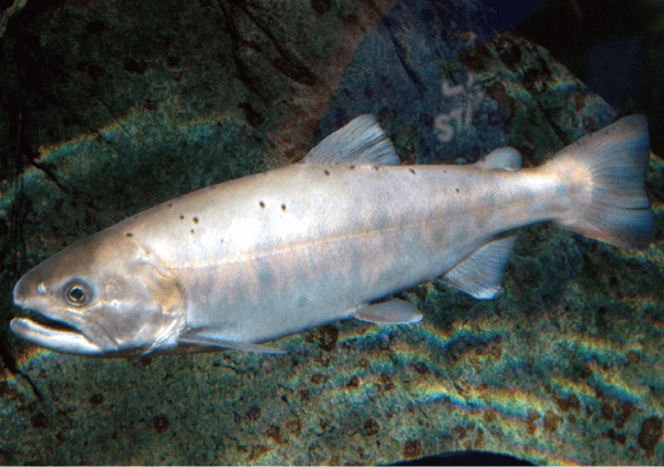 一方、サクラマスは体の色が銀色になり、海でたくさんのえさを食べて大型化します。海で1年ほど過ごして翌年の春に川をさかのぼり、秋まで川で過ごして産卵期をむかえます。