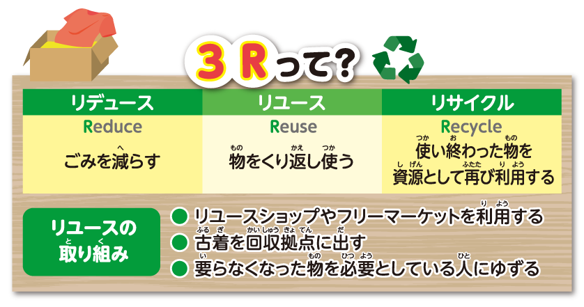 「リユース」とは、物をくり返し使うこと。ごみを減らし、資源を大切に利用するための取り組み「3R」の1つなんだ。「リユース」を利用すれば、通常よりも安くスキー用品がそろえられるだけでなく、地球に優しいよ。