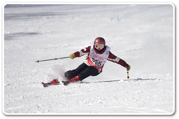 スキーでターンをするときは、 体をひねるときれいなターンができる。