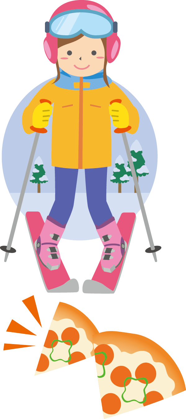 ハの字で止まるときは、かかとを外におし出しながらスキーを開こう。ピザをイメージするとハの字をキープしやすいよ!