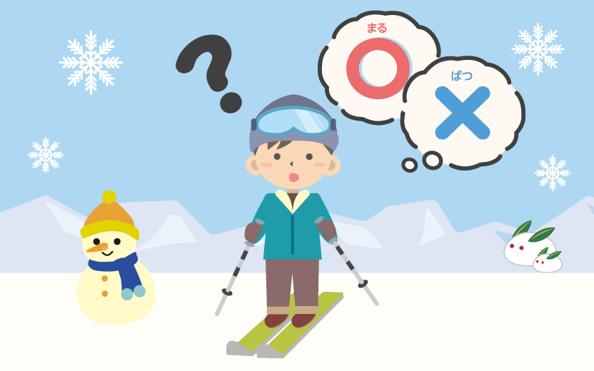 次の〇×クイズを解きながら、スキー上達のためのポイントを見てみよう!みんなはどれぐらい正解できるかな?それぞれのポイントをチェックしながら、スキー場でもすべってみてね!