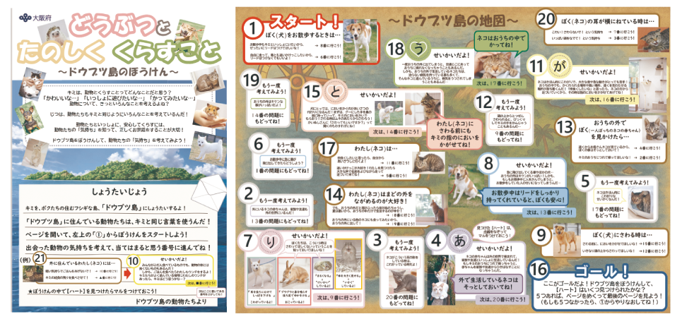 大阪府では「どうぶつとたのしくくらすこと」というリーフレットを毎年作っているよ! 動物と幸せに過ごすための情報がいっぱいだから見てみよう。