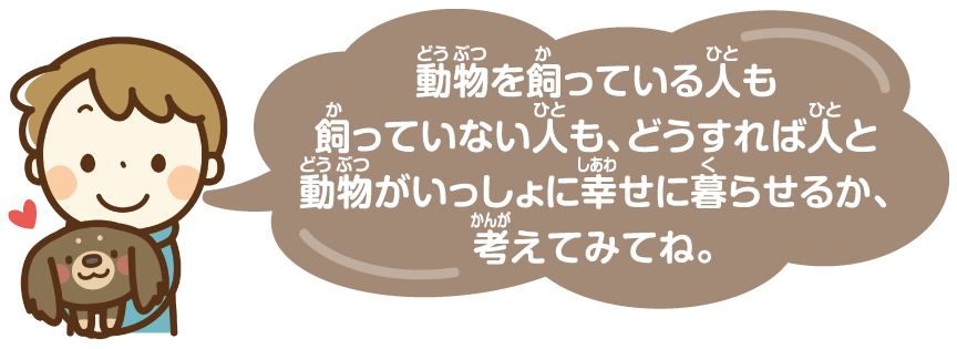 動物の命を大切にすることは、動物を飼っている人も飼っていない人も、忘れてはいけないこと。その気持ちは、自分や周りの人の命を大切にすることにもつながるよ。みんなで、もういちどじっくり考えてみよう!
