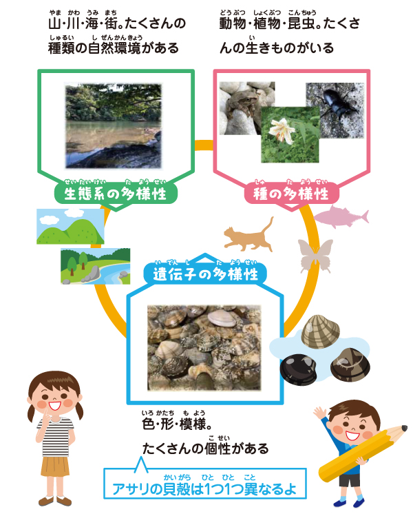 これらの生きものたちは、長い歴史の中で、川や海、森など、異なる環境下で自分たちの生きる場所を見つけながら共に進化し、複雑に関わり合いながら生きてきたよ。この生きものたちの豊かな個性とつながりのことを生物多様性といい、この生物多様性には、下のイラストにあるように、