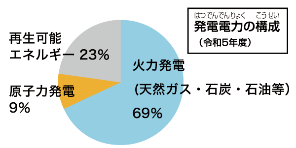 私たちは毎日の生活の中でいろいろな電化製品を使うよね。電気をつくる方法には、火力発電、水力発電、太陽光・風力・地熱発電、原子力発電などがあって、日本は火力発電の割合が多いんだ。火力発電は石油や石炭などを燃やすことによって発電する方法なので、多くの二酸化炭素が発生してしまう。また、燃料の石油・石炭・天然ガスは限りある資源のため、いつかは使えなくなってしまうと考えられているよ。