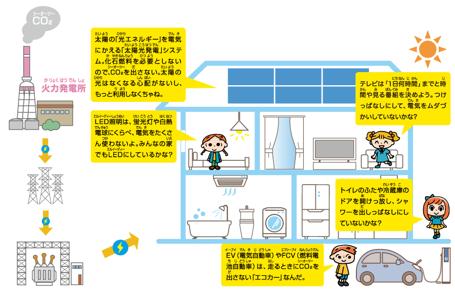 だから、テレビやエアコンの使用時間を少なくして電気を節約したり、二酸化炭素が出ないクリーンなエネルギーを使って電気をつくったりすることが大切なんだ。
