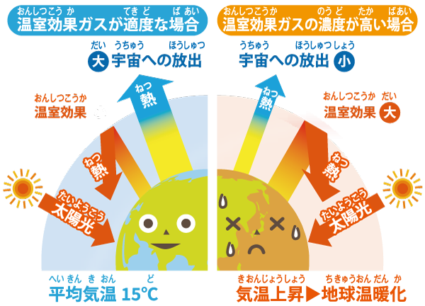 地球の大気にふくまれる温室効果ガス(CO₂など)には、太陽からのエネルギーを宇宙ににがさないようにして、生き物が生活しやすい気温にする働きがあります。ところが、CO₂の量が増え過ぎると、地球がどんどん暑くなってしまいます。