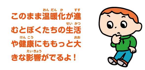 空気中の二酸化炭素が増え続けると、地球全体の温度が上がって、気温が高い日が続いたり、雨が多く降る日が続いたりして、いろいろな影響が出てくるよ。これが、地球温暖化なんだ。地球温暖化を防ぐには、空気中の二酸化炭素の量をできるだけ少なくすることが大事だよ。