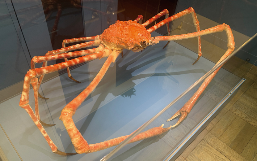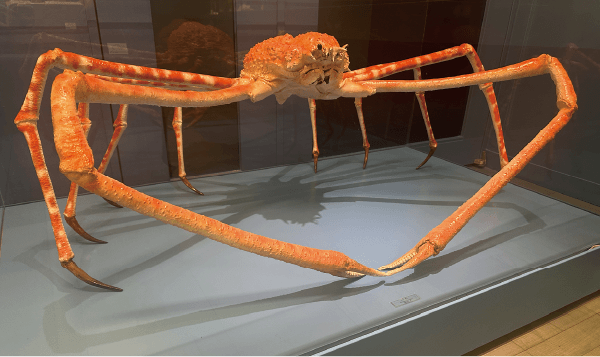 そして、最大級のタカアシガニでは、一番前のあしを拡げた大きさが3.8mにもなります。その巨大さはだれもがおどろくほどで、世界中の水族館や博物館の人気者です。生息地は、東北地方から九州沿岸にかけての太平洋側と台湾近海の深海で、日本周辺の海域の固有種です。中でも駿河湾は代表的な産地として有名で、特に伊豆半島西部の戸田などで漁獲されています。