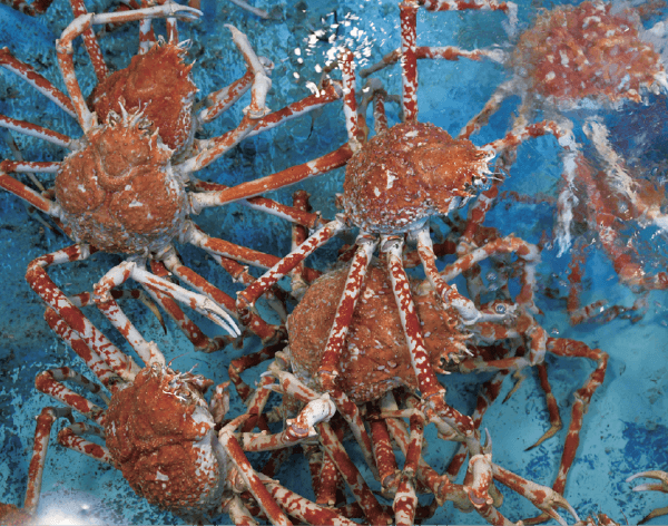 この巨大なカニは水深200メートルより深い深海にすんでいて、主に冬から春にかけての底曳網漁でとられています。生態については不明なことも多いのですが、大きく成長するのには長い年月がかかることが分かっています。タカアシガニを守り続けるためには、管理しながら利用することが重要です。