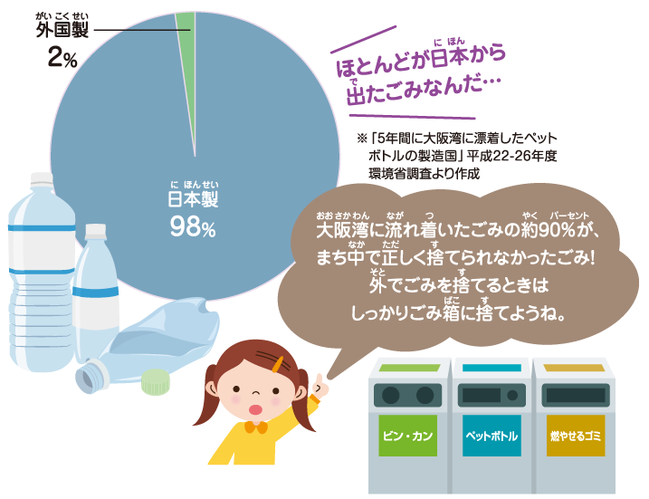 実は、ポイ捨てされるごみの約半分が空き缶とペットボトル。でもこの2つは、正しく分けて捨てれば、リサイクルできる物だよね。つまりポイ捨ては、資源をむだにする行動でもあるんだ。
