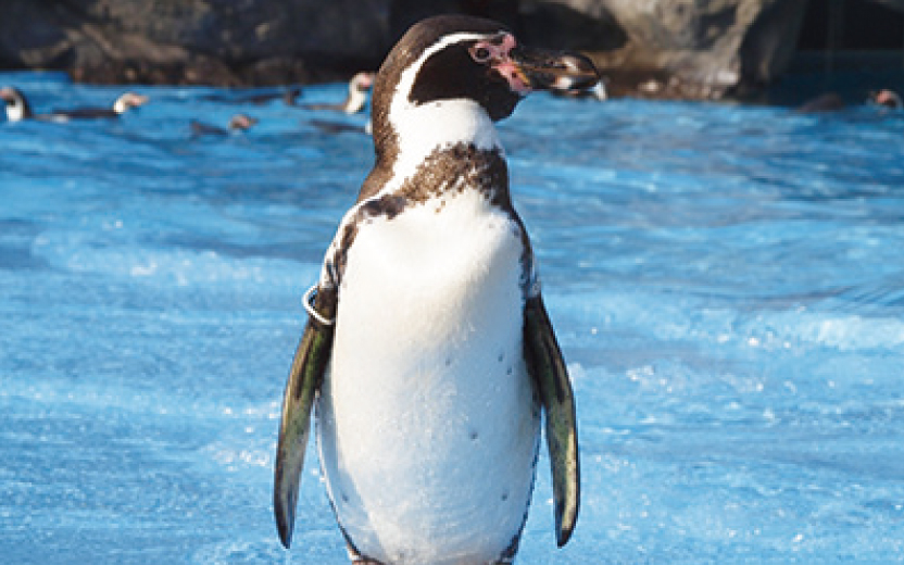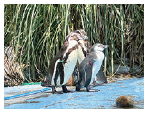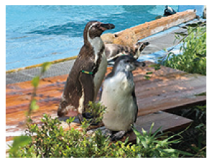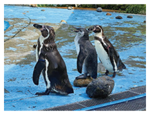 フンボルトペンギンは、産卵からふ化までがおよそ40日、ふ化から巣立ちまでがおよそ70日です。卵は巣箱の中でオスとメスが交代で温めます。当園では、この春に抱卵中(卵を温めている間)の事故が無いようにと、ニセモノの卵をだかせ、卵をふ化直前まで人工的に温めました。そして5月に、5年ぶりに2羽のヒナが無事に産まれました。