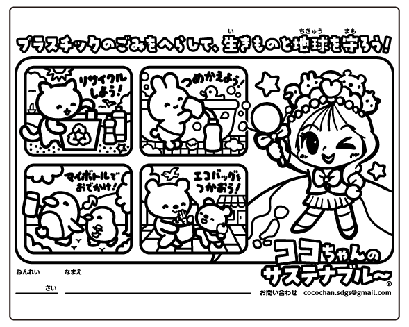 ココちゃんは、東京に住む高校3年生の女の子。ボランティア活動を通して、子どもたちといっしょに環境問題を学んでいるんだって。そんなココちゃんが、ぬりえを作ったよ!このぬりえを楽しみながら、プラスチックごみを減らす活動に取り組んでね!