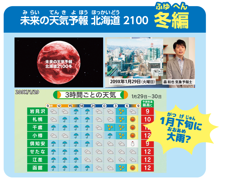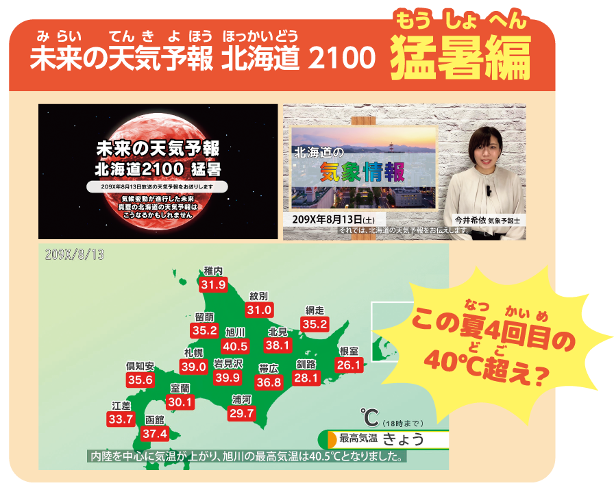 気候変動は身近に感じにくく、対策を考える機会も少ないのが現状です。そこで道総研では、科学的な予測データをもとに、未来の北海道の天気予報動画を作りました。