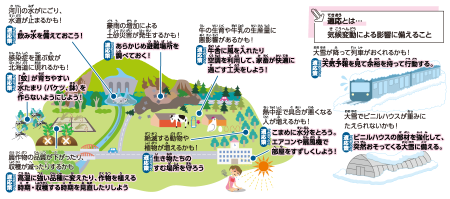 地球温暖化により、私たちの生活にも影響が出ています。身の回りに起きる変化と、それに備えるための「適応」について、いっしょに考えてみましょう。