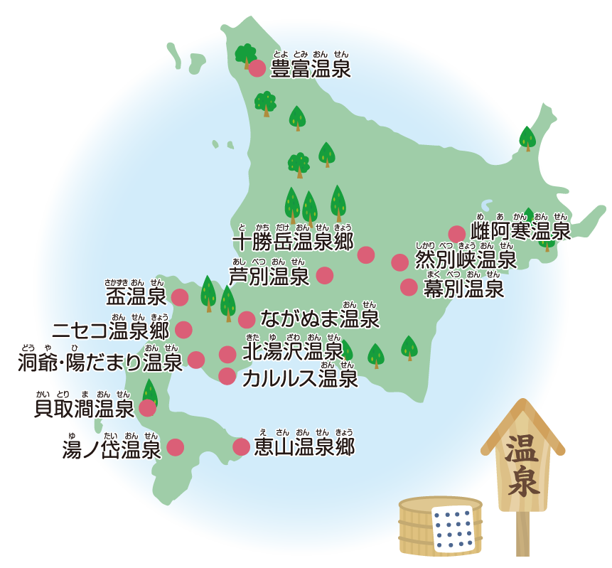 北海道には16の温泉郷(複数の温泉地が集まったもの)があり、大半は食塩泉または重曹泉で、他にも硫黄泉、酸性泉、鉄泉など種類も豊富。中でも十勝川温泉に代表される「モール温泉」は全国的にもめずらしく、北海道遺産に選定されているよ。泥炭を通してゆう出する黒っぽい茶色の温泉で、美肌の湯としても人気なんだ。