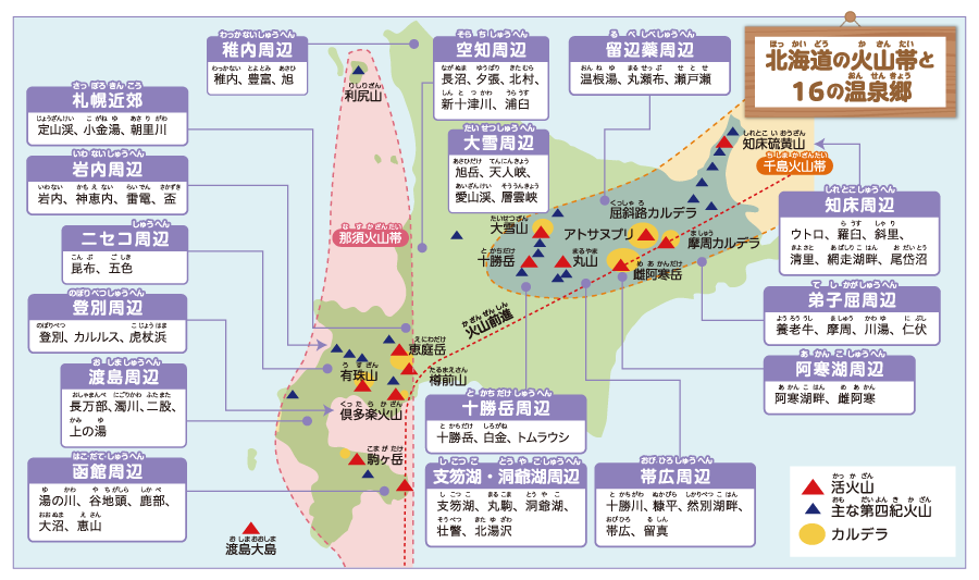 下の図のとおり、道内には「千島火山帯」と「那須火山帯」が縦横にあり、有珠山や十勝岳、駒ケ岳、樽前山、雌阿寒岳など、活火山がたくさんあるんだ。多くの温泉は、それら火山帯の上にあることが分かるね。地下深くで温められた地下水がわき出る「非火山性温泉」もふくめて、豊かな温泉資源は大切な自然のめぐみといえるよ。