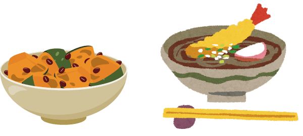 「ん=運」が重なる食材を食べて運気を上げる。なんきん(カボチャ)、ニンジン、レンコン、ギンナン、うんどん(うどん)など。