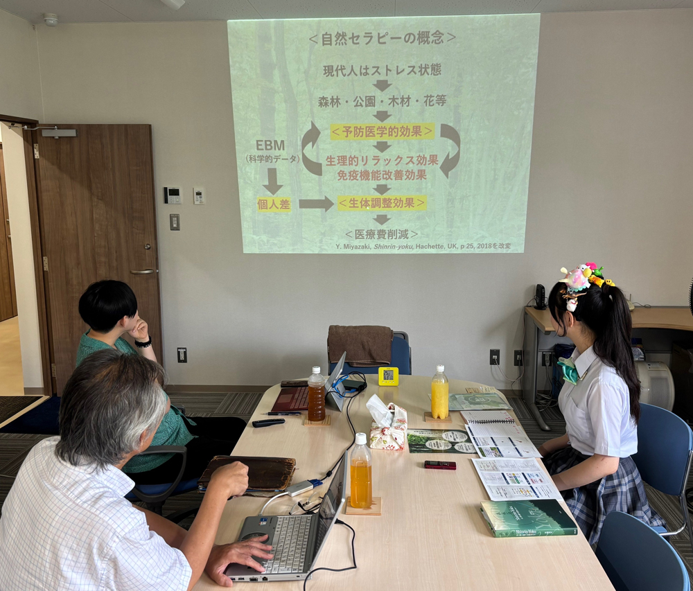 今回はこの「自然と私たち人間」の関係について、自然セラピーの第一人者である宮崎名誉教授と池井准教授がいる