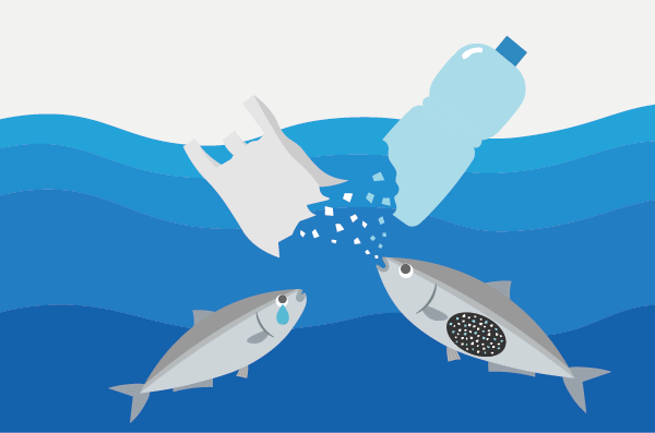 この海ごみの大半はプラスチック。プラスチックは自然にはほとんど分解されず、環境中に長い時間残留してしまうよ。また、特に心配されているのが、プラスチックが紫外線や波の力により細かくくだけたかけら“マイクロプラスチック”。5㎜以下になった小さいかけらが、食物連鎖に入りこみ、海の生態系全体に大きな悪影響をあたえてしまうのではと、心配されているよ。