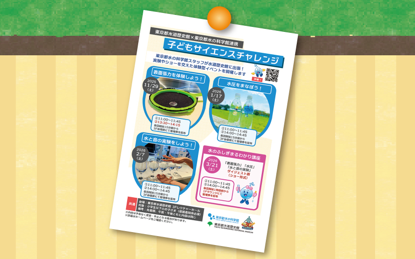 東京都水の科学館スタッフが水道歴史館に出張し、実験やショーを交えた体験型イベントを開催するよ。毎回、実験内容は変わり、1月は「水圧の実験」、2月は「水と音の実験」、3月はショー形式の「水のふしぎまるわかり講座」を行うよ。興味のある回にふるって参加してね!