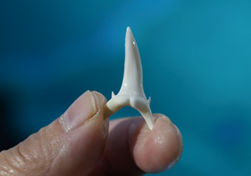 シロワニが泳ぐ水槽では、ダイバーが底に落ちているシロワニの歯を拾うことがあります。これは、歯が生え変わる際に自然にぬけ落ちたもので、細長くするどい形をしています。この歯を使って、魚などの獲物が近づいた瞬間に素早くかみつき、とらえます。