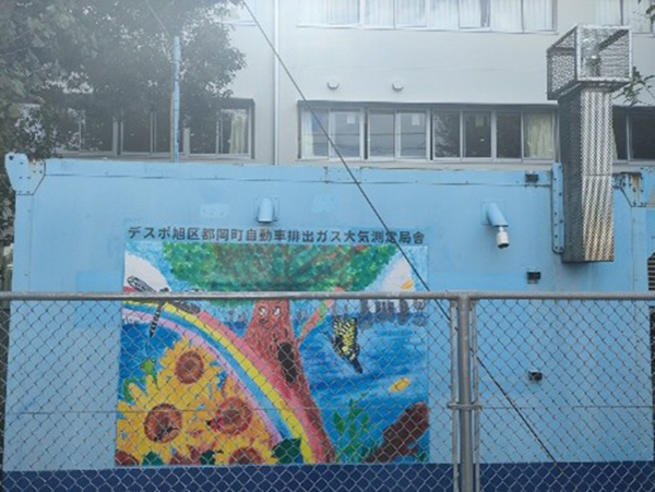 道路沿い27カ所の場所で、毎日ずっと空気の様子を調べているよ。これは、みんなが安心して暮らせるようにするため。調べた結果は、横浜市のホームページで見ることができ、光化学スモッグ注意報を出すときにも使われているよ。また、昨年、旭区の都岡小学校内にある空気を調べている場所のかべに、小学生の絵をはったよ。これは「みらいのよこはま」をテーマにした絵のコンクールで選ばれた作品なんだ。この絵を見た人が、環境のことを考えるきっかけになるといいなと思っているよ。