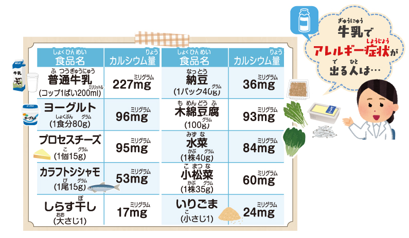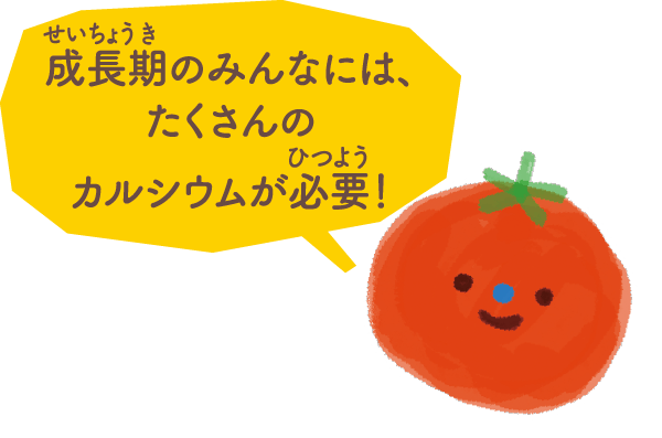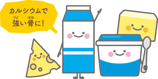 牛乳や乳製品に多くふくまれるカルシウムを とることが、成長期のみんなにとって大切だよ。 カルシウムの働きや、1日にどれくらいのカルシ ウムをとれば良いかなど、いっしょに見てみよう。