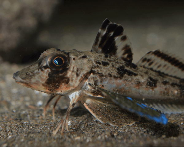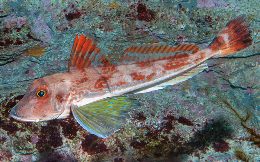 全長約30㎝になるホウボウは、印象に残りやすい特徴をいくつか持っています。大きな頭からしっぽに向かって細くなる体は、アイスクリームのコーンのような形をしています。大きくて色あざやかな胸ビレは、まるでチョウの羽のようです。そして、胸ビレの下に、足のように見えるものが生えています。あれは、何でしょう?