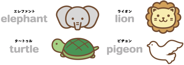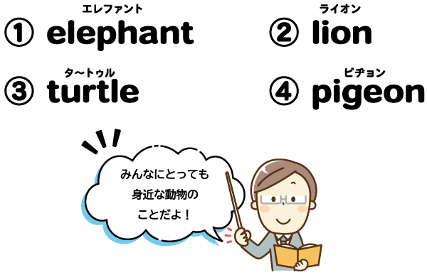 その他の単語は、①elephant=ゾウ、②lion=ライオン、③turtle=カメ、という意味だよ。