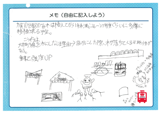木の駅はすてきだと思いました。わたしも多摩の森にどんぐりの苗木を植えに行きたいです。
