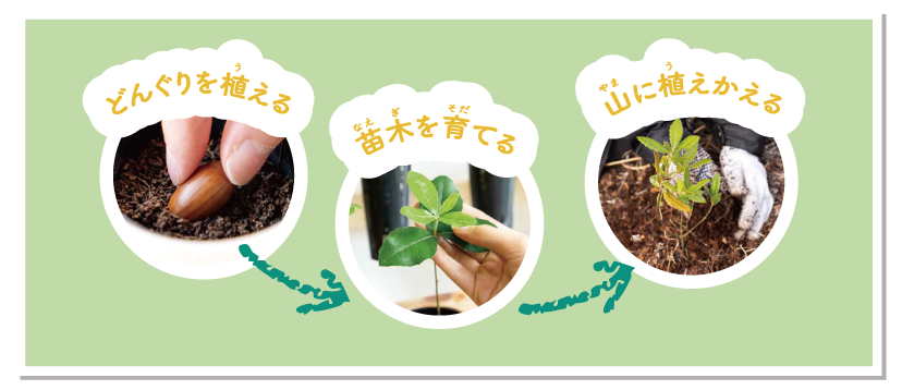 「伐って、使って、植えて、育てて、循環をつくる」という持続的な森林サイクルを保つために、駅員さんや工事をする人たちが、池上線の4つの駅でどんぐりから苗木を育てているよ。約2年かけて育てて、大きくなったら多摩の森に植えるんだ。大きく成長したら、どこで使われるのかな? 楽しみだね。