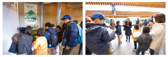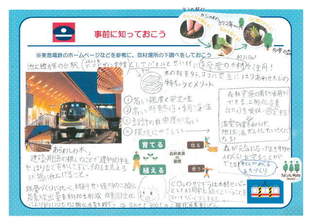 日本では国産木材の利用が進んでいないことによる林業事業者の減少や、森林の適切な伐採がなされていないといわれているんだ。だから、国内の木材利用を進めることで、「伐って、使って、植えて、育てて、循環をつくる」という持続的な森林サイクルを保とうとしているよ。東急電鉄では、木の温かみが感じられる木造駅舎を生まれ変わらせる「木になるリニューアル」や、五反田駅、旗の台駅、千鳥町駅、蒲田駅の構内でどんぐりからの苗木を育てる活動「駅から始める未来の森づくり」を行っていて、6人はこういっためずらしい取組を取材したよ。