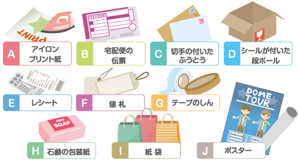 油や食べ物の残りかすが付いている物、防水加工された物(紙コップ、アイスクリームの容器など)、ティッシュペーパー、においの付いた紙(洗剤の箱など)、写真、レシートなど