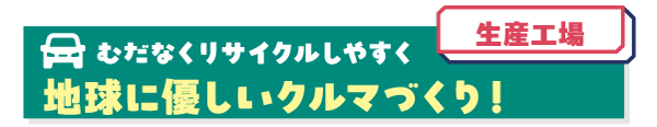 クルマをつくるとき、鉄やアルミ、プラスチックなどの材料をできるだけむだにしないようにするだけでなく、パーツを外したり分けたりしやすくするなど、役目を終えた後にリサイクルしやすくするための工夫もしているよ。太陽光パネルの活用など、工場に工夫しているところもあるんだ。