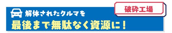 解体工場で部品やタイヤ、ガラスなどを外したクルマを巨大な機械でくだいていくよ。粉々になったら、いくつもの選別機を通して、種類別に分別するんだ。鉄やアルミ、銅、プラスチックが資源として再利用されるよ。なんと解体したクルマのほとんどがリサイクルされているんだ。
