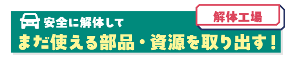 役目を終えたクルマを安全に解体するため、残った燃料のぬき取りやエアバッグの処理、フロンガスの回収を行うよ。まだ使える部品は取り外して安全に使えるかチェック! 確認後、「リサイクル部品」として販売するんだ。残った骨組み部分は解体・プレスするよ。