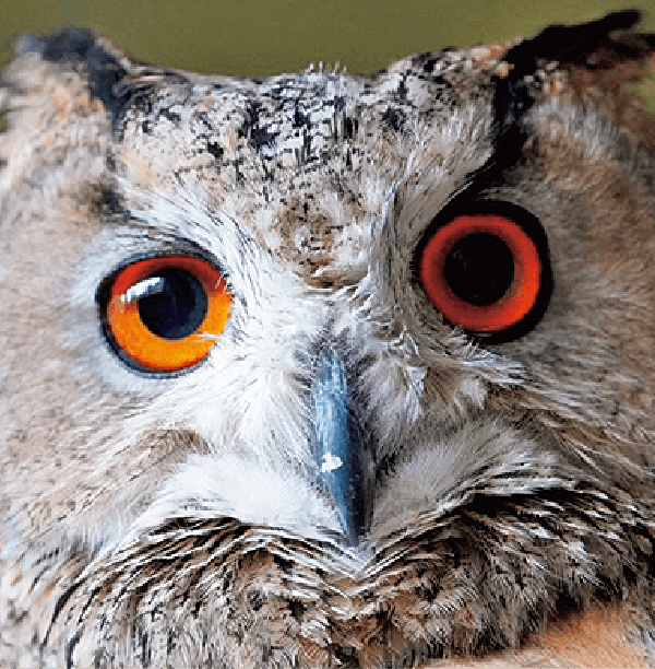 ユーラシアワシミミズクは、その名の通りワシのように大きいミミズクです。フクロウの仲間では最大級で、つばさを広げると1.8mもあります。ミミズクがフクロウとちがうのは、頭に耳のようにつき出た羽、「羽角」があることです。ユーラシアワシミミズクは、立派な羽角と鮮やかなオレンジ色の目が特徴です。羽角がねていて丸い顔をしていたらリラックスしている状態です。反対に、羽角がピンと立ち、顔や体が細くなっているのは警戒をしているときです。
